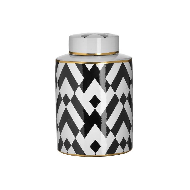 3709020229 KERAMIČKA VAZNA SA POKLOPCEM CRNO BELI DEZEN 17X28 CM